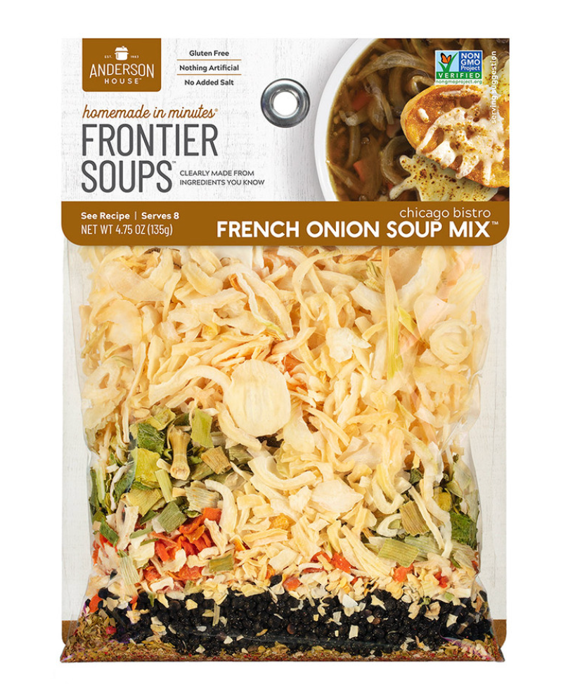 Chicago Bistro French Onion Soup with black lentils and sliced onions has substance and nutrition not in a typical French onion soup. Rich and robust on its own or extra luscious with French bread and cheese topping, this gluten free soup is hot and ready in just 50 minutes.