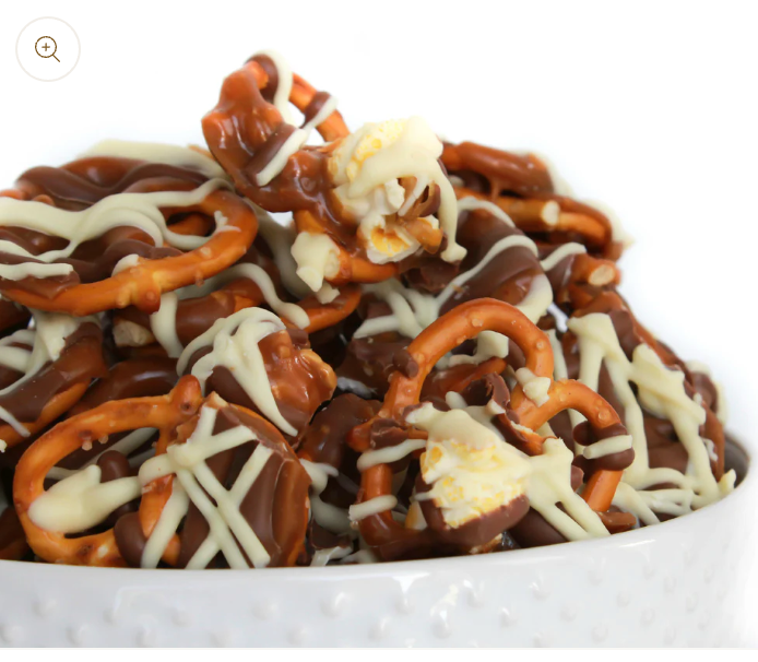 Two twisted for words. Clusters of pretzels and kettle corn. Drizzled with toffee and a duo of milk and white chocolate then sprinkled with chopped almonds. The original 'Double' addiction!