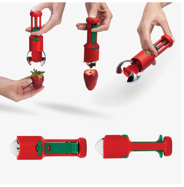Hullapit is a 3-in-1 fruit tool that hulls strawberries, pits cherries and olives, and catches their stones.