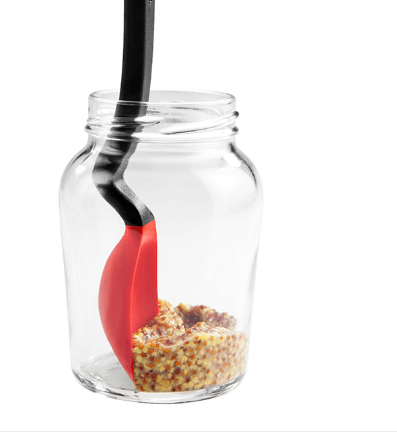 It has a flat squeegee tip and flexible scraping sides which make it awesome for scraping every last little bit out of a jar or container.