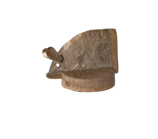 4"L x 2-1/4"W Hand-Forged Metal Mouse Shaped Cheese Knife w/ 2-1/2" Round Mango Wood Stand, Antique Brass Finish & Natural, Set of 2