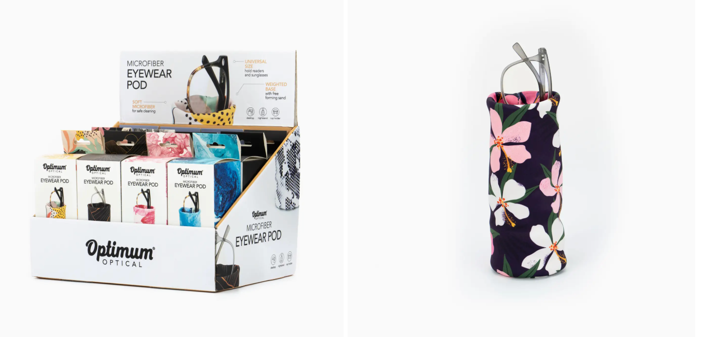 Always looking for your eyewear? Keep better track of your readers and sunglasses with our microfiber eyewear pod. A weighted, sand-filled base is great for use on your desk, nightstand or cupholder to safely store your glasses, while its soft microfiber doubles as a gentle lens cloth. Patterns coordinate with our new sunglasses program (#OPTS-U48) and cleaning cloths