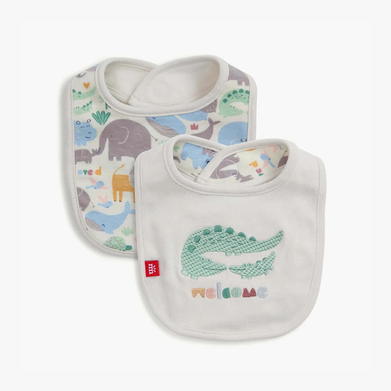 Our organic cotton Magnetic Reversible Bib 2-Pack protects baby's outfit with soft, absorbent, GOTS-certified organic cotton. Plus, the magnet strategically placed at the back makes it seriously easy to put on and take off. The bib is both casual and fancy with a lively print on one side and beautiful embroidery on the other.