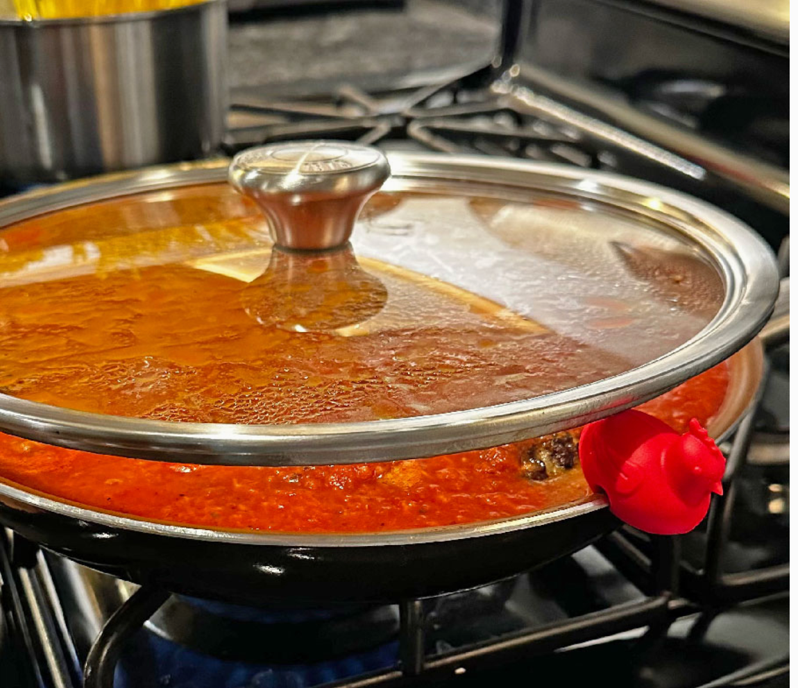 Mini silicone pot watcher elevates lid to vent steam, maintaining optimal cooking conditions. Controls moisture and prevent boil overs during cooking. Safe for temperatures up to 446°F/230°C. Dishwasher safe. Great storage size.